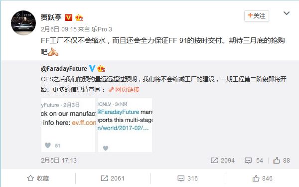 日前,针对近日外媒对FF工厂建设将缩水的说法,乐视掌门人贾跃亭在其个人认证微博上表示:“FF工厂不仅不会缩水,而且还会全力保证FF 91的按时交付。”