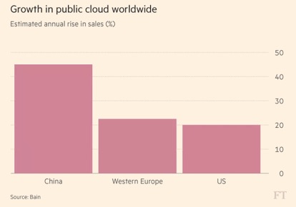 在中国市场,公共云的整体市场规模正在迅速增长,增速大幅高于西欧和美国市场。据研究机构Gartner,中国公共云市场整体规模将从2016年的112亿美元增长至今年的142亿美元。同期,美国市场规模达到了1410亿美元。