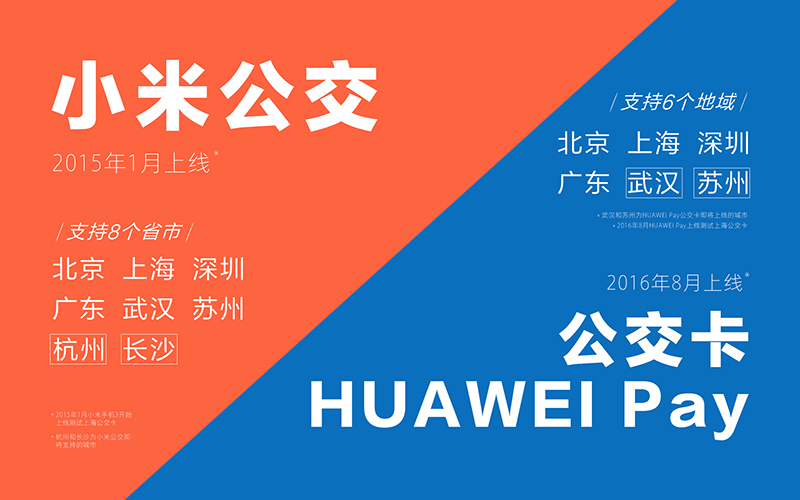 加上2015年率先布局手机公交卡的小米,国内厂商在智能出行领域又掀起一场军备竞赛。小米在2015年1月就上线上海公交卡(当时为小米手机3),正式涉足手机智能出行,用一台手机就可以乘公交、坐地铁、便利店购物和给其他公交卡充值。2016年2月24日随着支持全功能NFC的小米5发布,小米在手机公交领域进入快速发展阶段,过去一年多时间前后上线支持了北京、上海、深圳、武汉、苏州、广东(岭南通)等6个省市,并且杭州公交卡已经进入MIUI开发版,长沙公交卡也正在内测,小米公交支持8个省市公交卡,大幅领先于国内其他手机厂商。