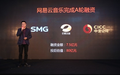 4月11日,知名在线音乐平台网易云音乐在上海召开发布会,在公布用户数突破3亿的同时,对外宣布公司近期已完成A轮融资。网易云音乐CEO朱一闻介绍,此轮融资金额为7.5亿元,由上海广播电视台、上海文化广播影视集团(简称“SMG”)战略领投,芒果文创(上海)股权投资基金(简称“芒果文创”)、中金佳泰基金参投。此轮融资后,网易云音乐估值达80亿元。这意味着上线仅四年的网易云音乐,已直接跻身中国互联网独角兽俱乐部。