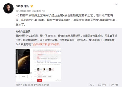 不过,不知出于何种原因,该配色在360手机N5标配中大获成功,引起用户广泛青睐的同时,并没有及时出现在高配版中,因此引发了部分用户的不满。4月18日,网友“小八宝惠子”在微博中询问:“最近想买个安卓机用,看中了360手机N5,最喜欢的就是慕斯黑,低调又有金属质感。可是等了好几次,都没有64G的,今天开售又没有。我想要容量大一点的手机,N5慕斯黑什么时候能有 64G 容量的呢?”李开新对此作出了将于4月20日首发慕斯黑高配版的回应。