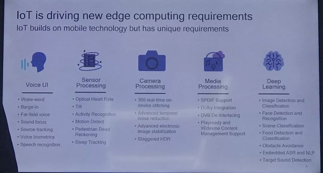 “高通不仅布局SoC芯片产品,也在软件进行了大量投入”,Seshu Madhavapeddy介绍,高通在物联网边缘计算领域打造了五类软件解决方案:语音交互、传感器处理、摄像头影像处理、媒体内容处理、深度学习。